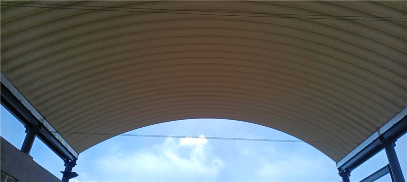 屋頂采用的板材為TS280GD-Z高強(qiáng)度鍍鋅鋼板,厚度1.0mm,寬度914mm,具備良好的抗腐蝕性與強(qiáng)度。結(jié)構(gòu)設(shè)計(jì)按照矢跨比0.2進(jìn)行合理拱形設(shè)計(jì),有效提高了屋面的排水能力和抗風(fēng)能力。