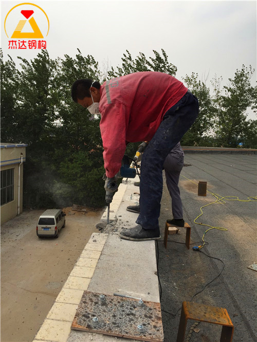 穿墻預埋件通常沿墻體頂端均勻間隔布置,配合膨脹螺栓或化學螺栓加固固定。此工藝主要解決在原有建筑沒有預留預埋件情況下的施工需求,常見位置包括水槽邊或圈梁部位。以下圖片來自江蘇杰達鋼結構工程有限公司在山東濰坊馳騁實業有限公司倉間罩棚施工現場,展示了穿墻預埋件的具體施工過程。