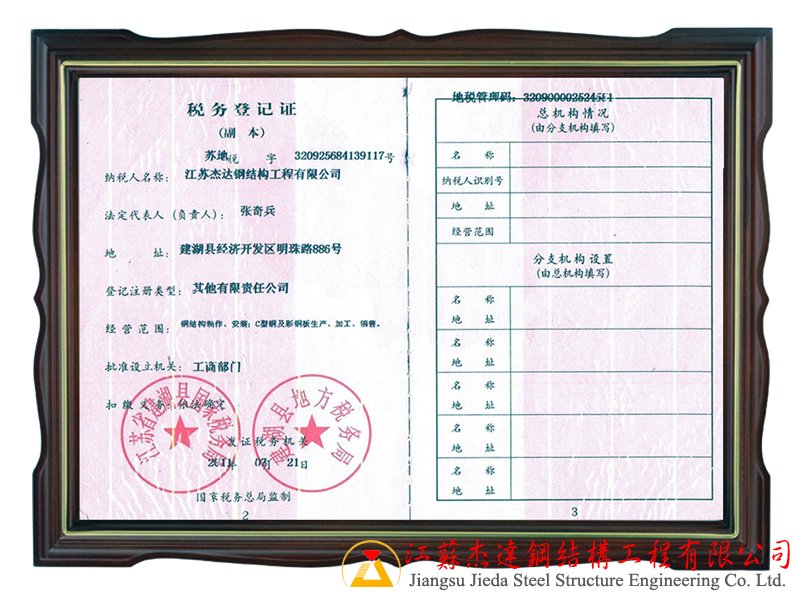 江蘇杰達鋼結構工程有限公司稅務登記證