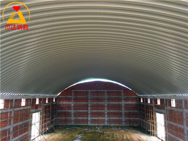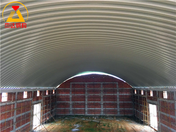 拱形屋頂設計在跨度和長度上經過精準計算,能夠有效承受外部風壓和自重。螺紋鋼的采用增強了屋頂的整體穩定性,托板和彩涂卷板的合理搭配進一步提升了抗腐蝕性能和使用壽命。