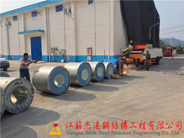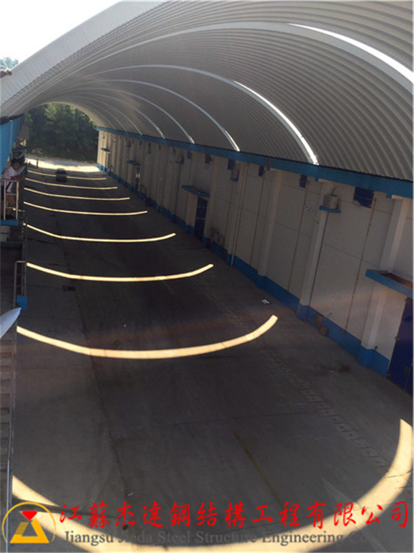 屋面材料選用了厚度為0.8毫米的灰藍色TS320GD-Z高強彩涂卷,具備較好的耐候性和美觀性。彩鋼板通過專用設備加工成型,保證了拱形屋頂的精確度和安裝效率。