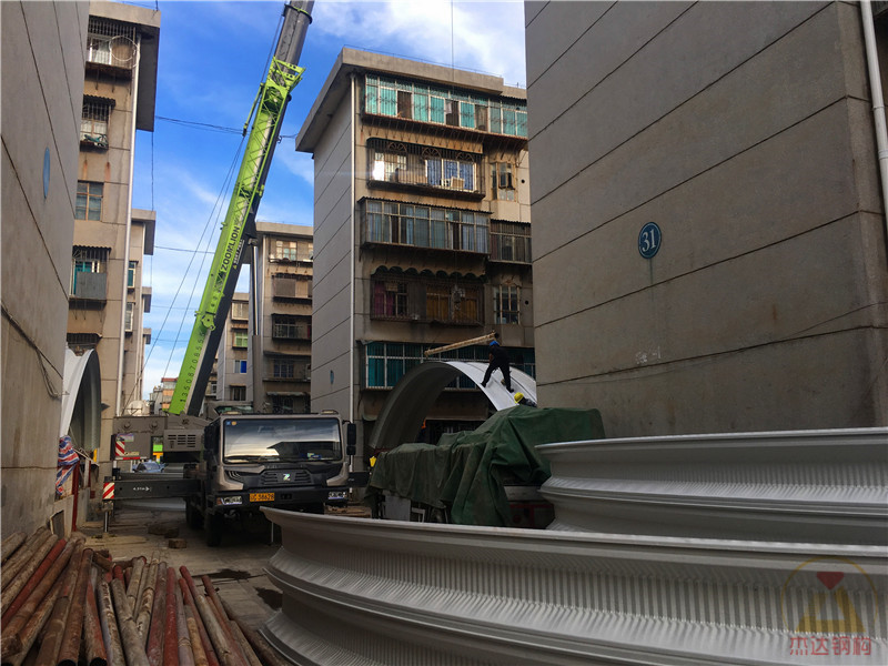 施工團隊在狹小的空間內進行瓦片組裝和吊裝作業,施工現場人流密集,必須合理調整作業順序以保證安全通行。由于空間限制,吊車被停放在兩棟車棚之間,極大考驗了施工人員的協調能力和操作水平。