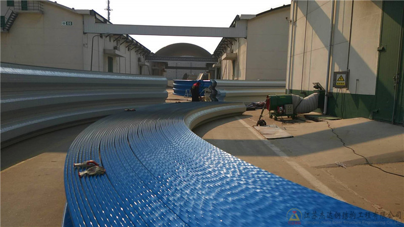 施工方面,江蘇杰達鋼結構工程有限公司施工團隊嚴格依照設計方案展開作業。現場照片顯示,彩涂卷板瓦片已完成生產,屋頂組裝工作正有序進行,部分拱形屋頂結構清晰可見,施工進展順利。