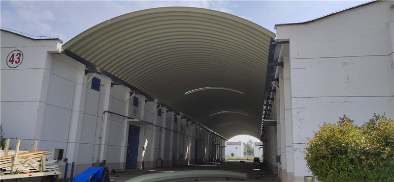 施工完成后的拱形屋頂罩棚整體外觀整潔,結(jié)構(gòu)穩(wěn)固,采光帶布局合理,為倉儲環(huán)境提供了良好的保障。