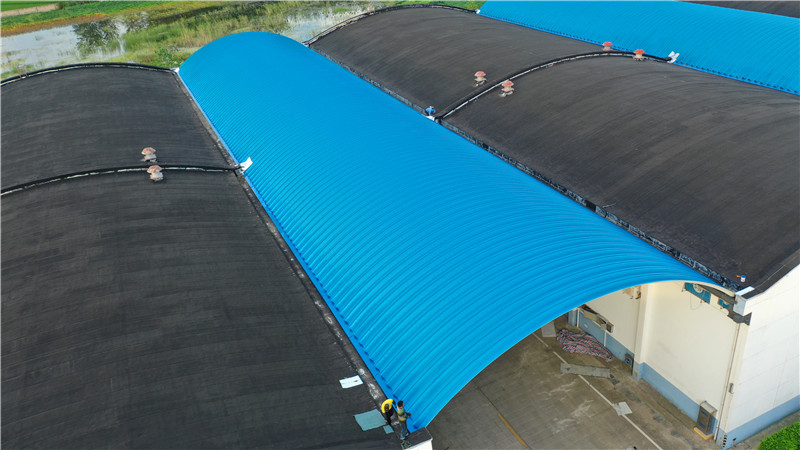 施工現場采用無人機航拍技術,直觀記錄了罩棚吊裝過程。現場照片顯示,兩棟舊有拱形屋頂狀態良好,光澤依舊,新增罩棚已完成約三分之一吊裝。高空視角下,去年完成的倉間罩棚位于糧庫兩側,今年施工的三棟罩棚則位于左下方和糧庫中間部分。